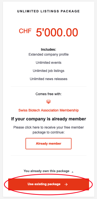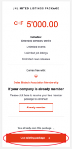 As a Swiss Biotech Association member, you profit from unlimited event listings for free. Click “Use existing package”.